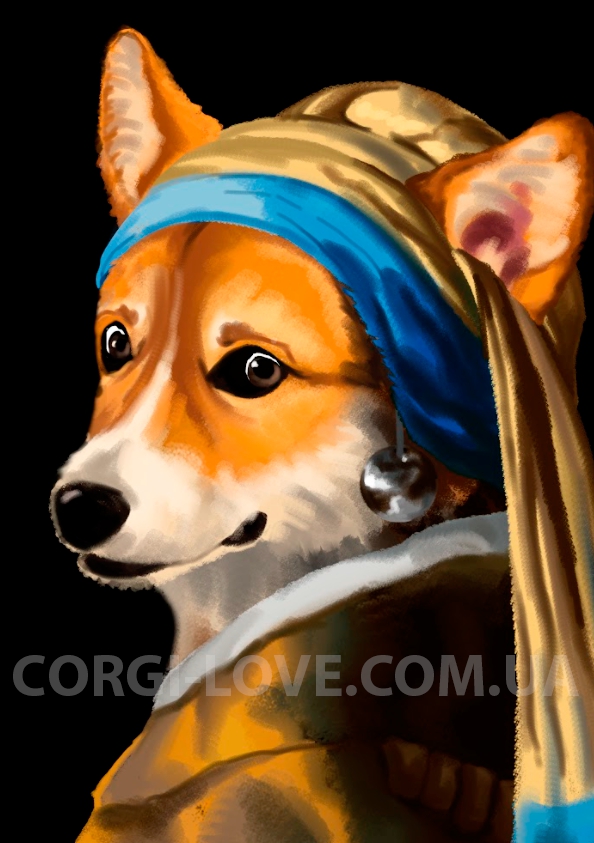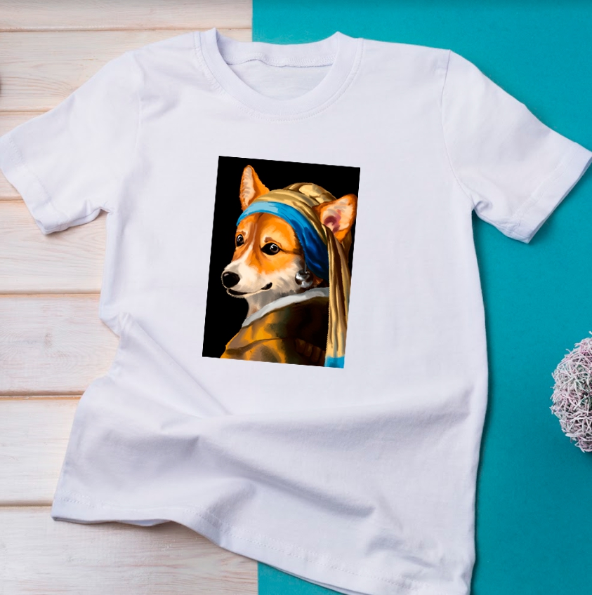ця незвичайна футболка з принтом коргі за мотивами картини видатного нідерландського художника на Вермєєра доводить, що привабливість погляду вельш коргі здатна заворожити та закохати в себе навіть самого вибагливого естета.